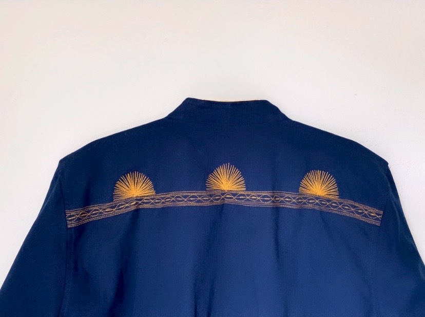 - Bordado de Autor: Un detallado patrón en el pecho y cuello que evoca la simetría de la naturaleza, ejecutado con precisión para resaltar sobre el fondo oscuro.